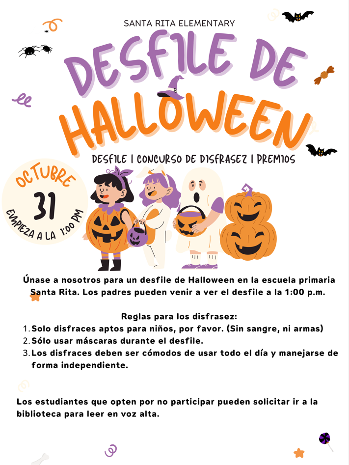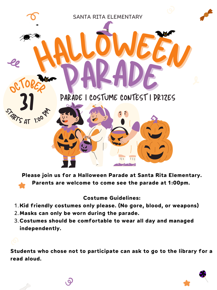 A reminder that our Halloween Parade will take place this Thursday from 1:00 to 2:00 PM in the grassy area of our campus. I've attached the map for your reference. Parents can start arriving at 12:50 PM. We will close the gates by 1:10 PM. Please see the flyer for costume guidelines.